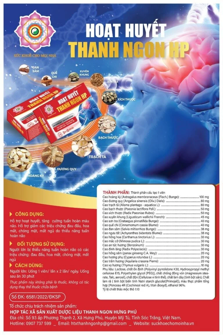 - Thành phần: Cao hoàng kỳ,cao đương quy, cao trạch tả, cao bạch thược, cao xuyên khung,cao sơn tra, cao quế chi,cao đan sâm, cao ngưu tất, cao hồng hoa, địa long, cao mắt cỡ, cao an tức, cao đinh lăng, cao hồng sâm, cao hương phụ, cao trầm hương, cao xạ hương, tá dược vừa đủ 1500mg. - Công dụng: Hỗ trợ Điều trị thiếu máu não thiếu máu cơ tim cục bộ, phòng ngừa tai biến mạch máu não, tê bì chân tay, đau đầu hoa mắt chống mặt,tăng cường tuần hoàn máu lên não, mất ngủ do thiếu máu não, rối loạn vận mạch ngoại vi, phục hồi di chứng sau tai biến. - Đối tượng sử dụng: Người lớn bị thiểu năng tuần hoàn não có các triệu chứng: đâu đầu, hoa mắt, chóng mặt, mất ngủ - Cách dùng: Người lớn: Uống 1 viên/ lần x 2 lần/ ngày. Thực phẩm này không phải là thuốc, không có tác dụng thay thế thuốc chữa bệnh. - Chú ý: Không sử dụng cho người mẫn cảm, kiêng kỵ với bất kỳ thành phần nào của sản phẩm. Người đang dùng thuốc cần tham khảo ý kiến của chuyên gia y tế trước khi dùng. Không dùng cho các trường hợp: phụ nữ có thai, cho con bú, phụ nữ bị rong kinh, bang huyết, người chuẩn bị phẫu thuật, người huyết áp cao, người bị rồi loạn tiêu hóa, lạnh bụng, người bị chứng tỳ thấp, đầy bụng và ỉa chảy, người không bị triệu chứng ứ trệ, người âm hư hỏa vượng, những người gầy cồm, có chứng hư chớ ăn, đau bụng, những người âm hư dương thịnh. - Bảo quản: Nới kho ráo, thoáng mát, tránh ánh nắng trực tiếp. Khối lượng trung bình viên: 1500mg ± 7,5%. - Đóng gói: Hộp /30 viên x 3 vĩ x 10 viên/thùng 90 hộp